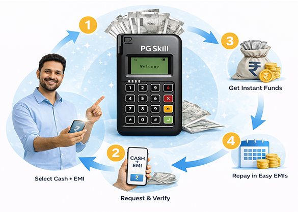 The Cash + EMI service is designed to make payments and financial support simple for customers. First, the customer selects the Cash + EMI service from the platform or website. After selecting the service, the user enters the required details and chooses the amount they want to process. The customer can then select a suitable EMI repayment plan based on their convenience and financial capacity. Once the details are submitted, the request goes through a quick verification process to ensure accuracy and security. After successful verification and approval, the requested amount is processed through the system. Finally, the customer repays the amount in easy monthly installments, making it easier to manage payments without financial pressure. This process helps users access funds quickly while maintaining flexible repayment