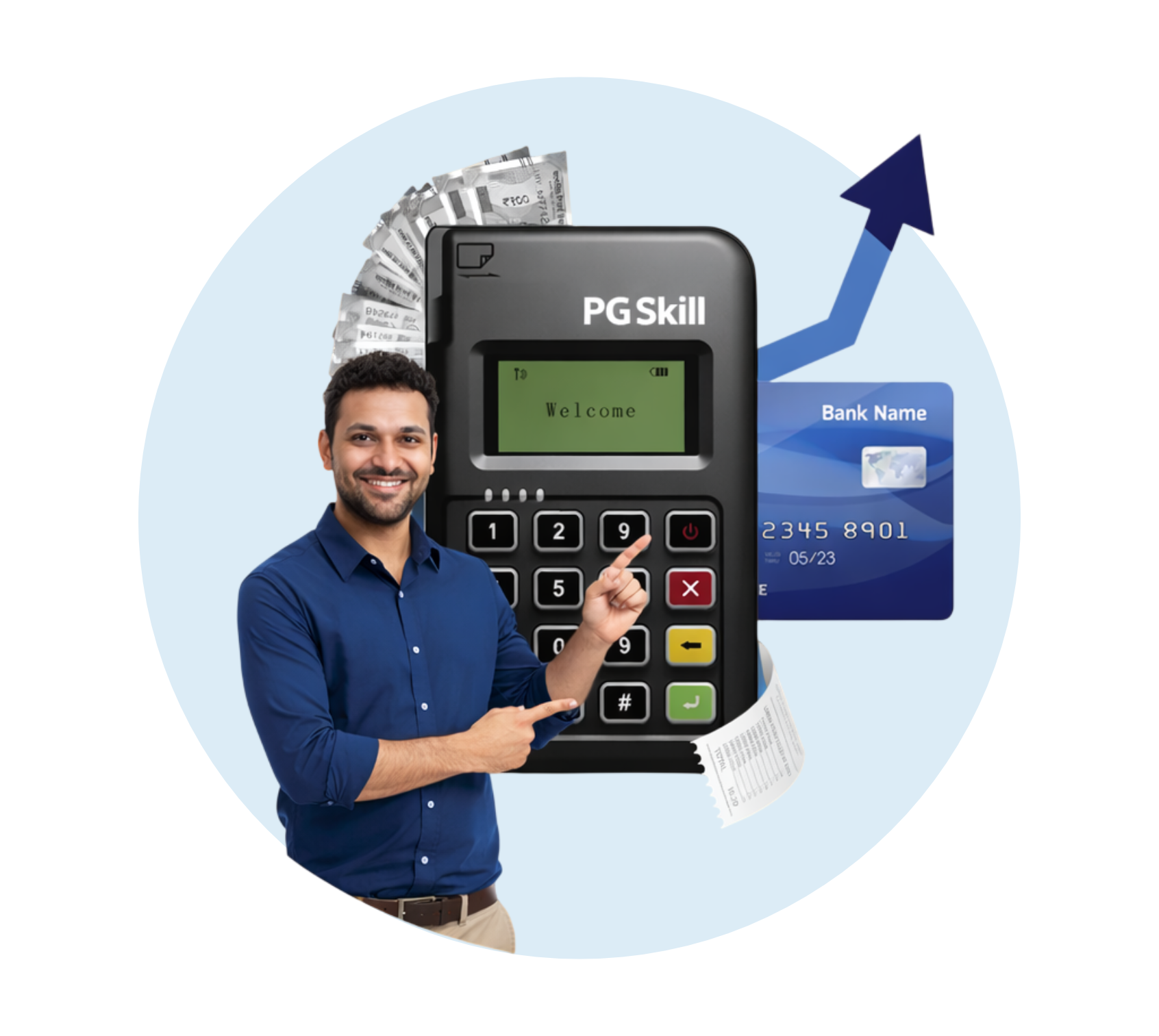 Accept payments easily! The PG Skill Micro ATM doubles as a POS machine, letting agents take debit/credit card payments for shopping or services